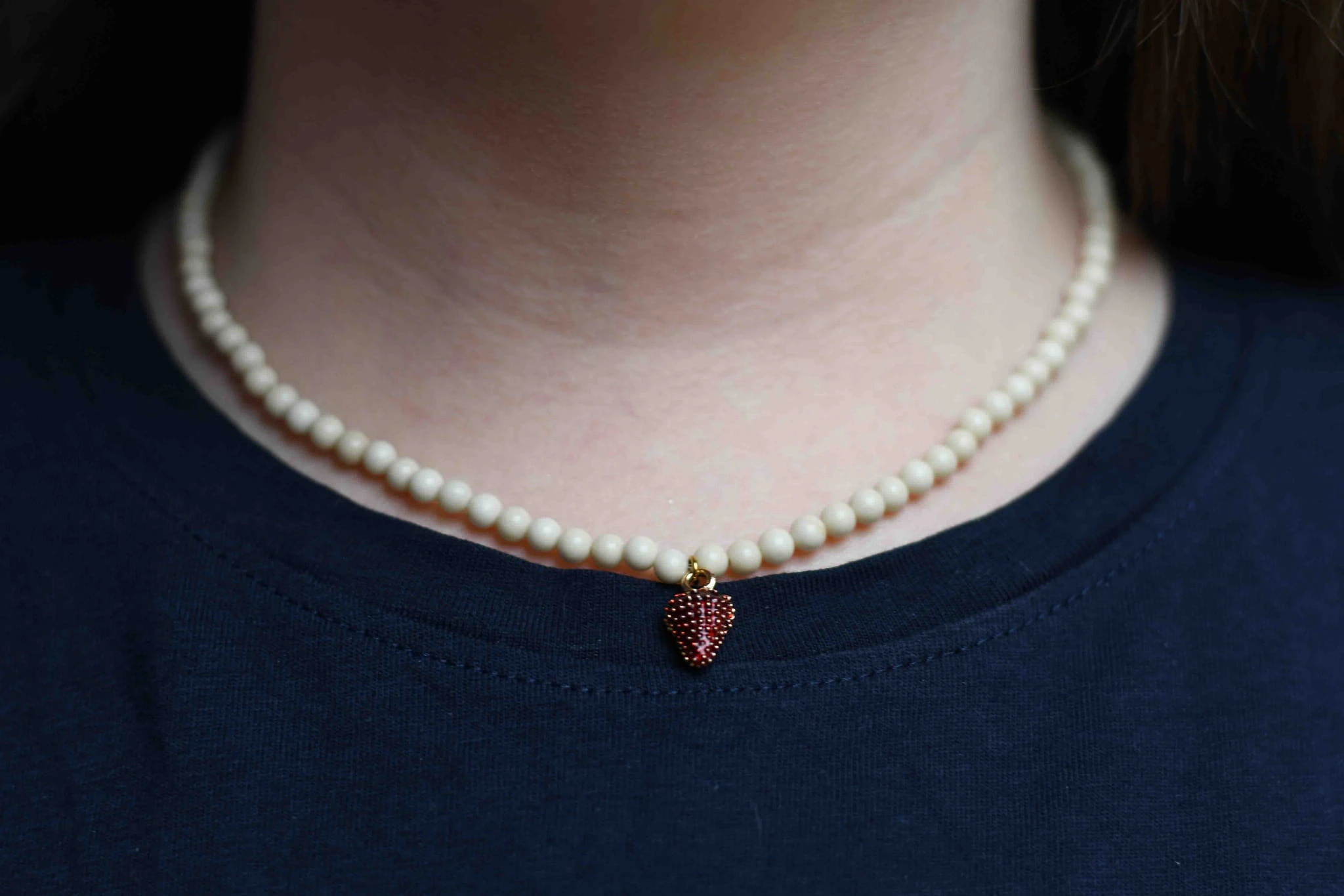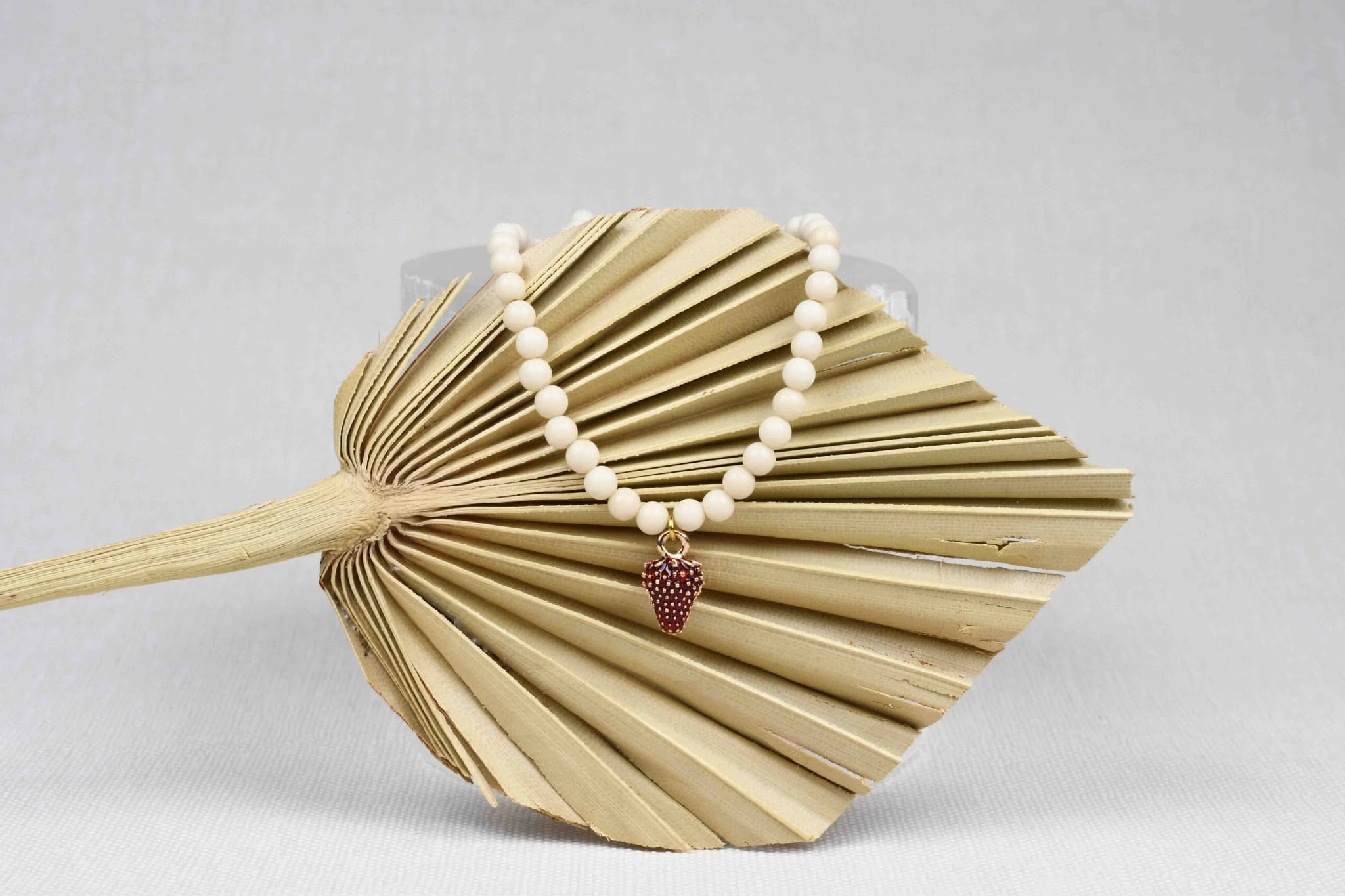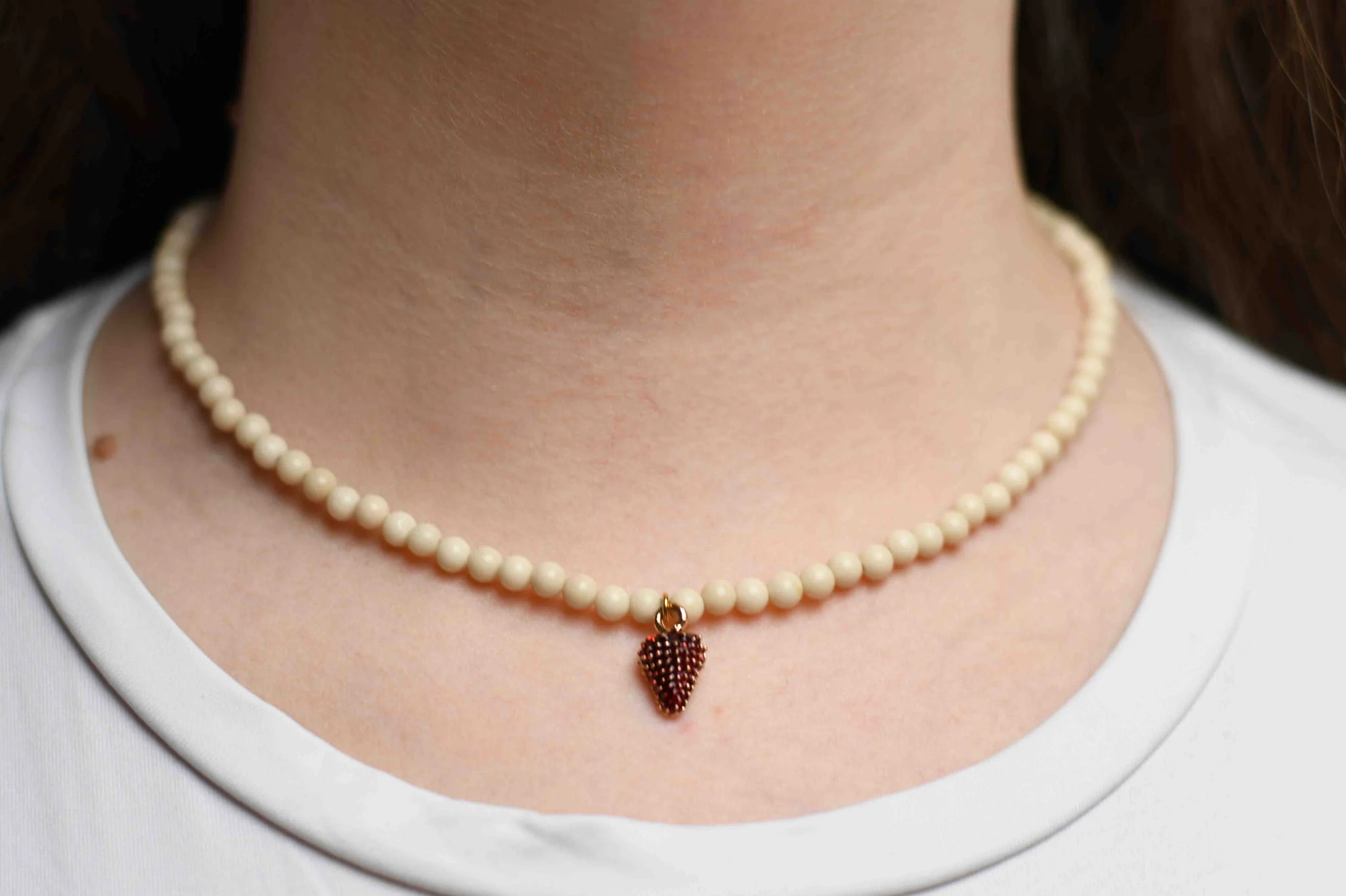 Naszyjnik został wykonany z kamienia rzecznego z dodatkiem uroczej zawieszki w kształcie poziomki.