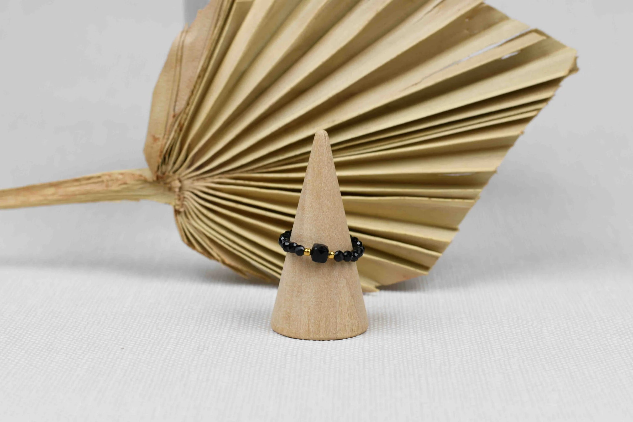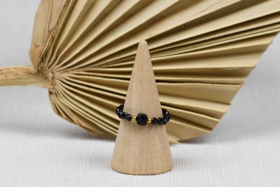 Pierścionek został wykonany ręcznie na elastycznej gumce, dzięki czemu łatwiej dostosować rozmiar. Kamienie jakie zostały użyte to czarny turmalin.